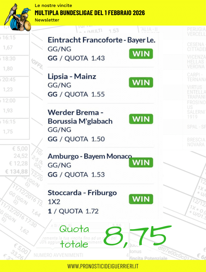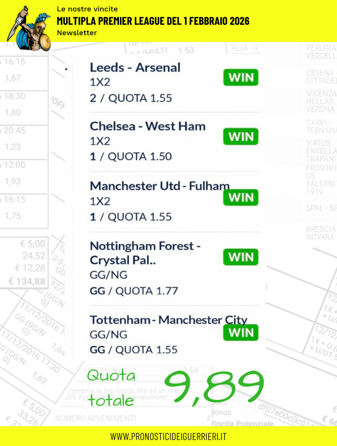 Tutti questi pronostici sono stati condivisi con i membri della nostra Community su questo sito, nel nostro gruppo Facebook, via newsletter o tramite il canale Telegram.